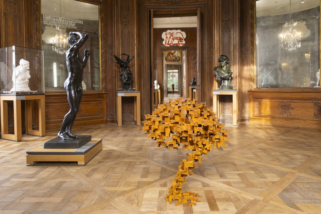 Inside the museum, you are back in Rodin’s world, the marvelous 18th-century Hôtel Biron, where he and many other artists once lived and worked. As you wander through the rooms full of various versions of his works, those of Camille Claudel and Rodin’s own art collection, you will be pleasantly surprised by an occasional sculpture by Gormley from other projects made during his 40-year career, cleverly juxtaposed with works by Rodin. Half of the plaster mold for one of Gormley’s statues of his own body (this one in a kneeling position), for example, stands next to Rodin’s mold of “Balzac’s Dressing Gown,” part of his extensive project for a portrait of the great writer. In the same room, small studies for the Balzac statue are joined by “Iron Model for Blackwood Stack,” a head made of slabs of iron, like a 3D puzzle with a prominent nose.