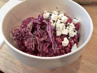 We were expecting oatmeal in the dishes we ordered, But if we had looked up the word “porridge” before we left home, we would have realized it can be used for any grain cooked in water or milk. We ordered two of the three available lunch porridges: One was beets, feta