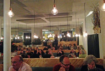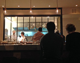 The restaurant’s decor has been revised, with unusual plywood paneling, a marble-topped bar facing the open kitchen, marble tables, mirrored walls in the lower dining room, and hanging bare-bulb light fixtures. The overall effect is a bit odd, but pleasant enough. Noise levels were kept pleasingly low thanks to panels on the ceiling, and, although we sat next to the door, we never felt cold thanks to a heavy curtain blocking out the chill winds of winter.