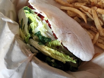 with baba ganoush, pickled cabbage, tomato, cucumber, spring onions, marinated peppers and herb salsa. Both sandwiches were served with great fries.
