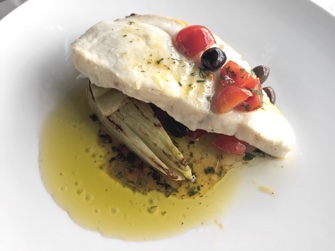 I much preferred Pierre’s fish of the day, whose name we had repeated to us several times butwhich I have been unable to verify. Suffice it to say that it is a Mediterranean fish that somewhat resembles monkfish, with firm, dense white flesh. It was beautifully dressed with a top-quality olive oil, black olives and tomatoes, and served on cooked fennel. Now that’s a summery lunch!