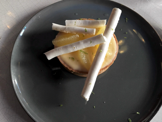 The creamy lemon tart I had for dessert featured a just-right crust and luscious cream with the always-welcome addition of zingy lime zest. It was topped with sticks of meringue and lemon sections (in theory, this is a good idea, but it didn’t taste good to me). My noble friend didn’t even try it because of her diet.