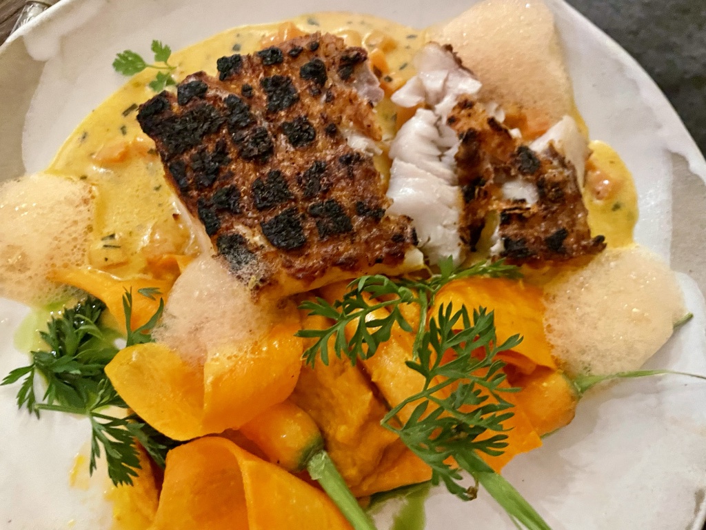 Bill followed up with another fish dish: a barbecued whitefish with beurre blanc with carrots, a Japanese-style carrot-and-ginger mousse and even more carrots, cooked in different ways.