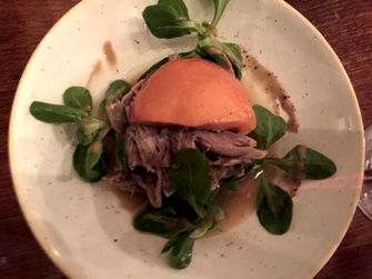 was even worse: absolutely tasteless shredded confit de canard served with half a canned peach.