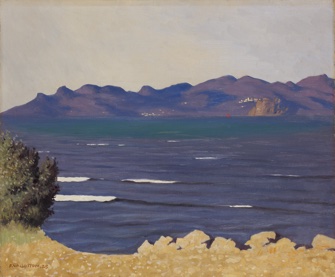 Three works by Vallotton also struck me: his moody “L’Estérel et la Baie de Cannes” (1925; pictured at the top of this page); “La Blanche et la Noire” (1913), his answer to Manet’s “Olympia,” in which the black woman appears to be the confidante rather than the servant of the naked, red-cheeked white woman stretched out on the bed; and the provocative “Le Chapeau Violet,” (1907), in which a woman in