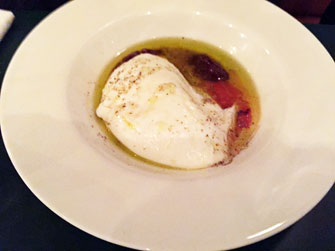 She was very happy with that unusual preparation, but she really went into fits of ecstasy over the next dish, a generous helping of burrata, served with a purée of red peppers, extra-fine olive oil and extra-extra fine tapenade, one of the best I have ever tasted. Wow. What a great combo.