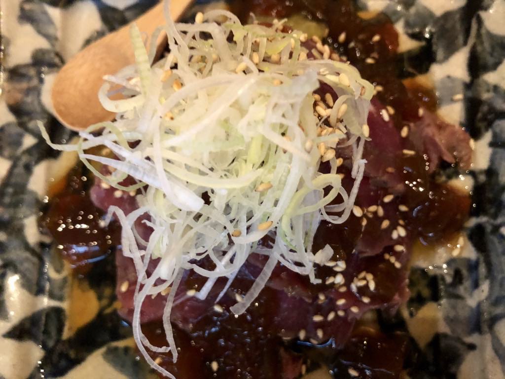 raw tuna marinated in soy sauce and served with wonderful fried baby leeks.