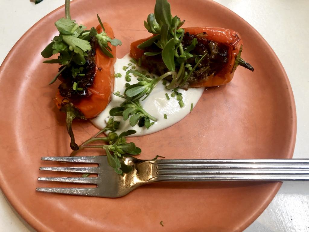 My first course was a fine pair of lamb-stuffed red peppers with baharat, a Middle Eastern spice mix, and a chickpea-based sauce. Perfectly balanced, with a nice grilled flavor.