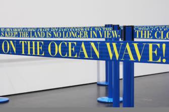 Visitors are given a boarding pass on arrival and must pass through those familiar crowd-control barriers (called “retractable belt stanchions,” I just learned). The difference is that the belts on this barrier, a work called “Untitled (Passage)” by Matthias Gommel, are