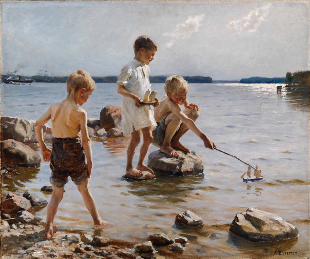 Edelfelt, a realist painter known especially for his history paintings and portraits, did have a sunny side, however, evident in the masterly, Impressionist-influenced “Boys Playing on the Shore” (1884, pictured at the top of this page).