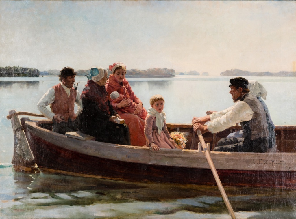 Amusingly, an American collector who admired this painting asked Edelfelt to make another version of it for him, but with happier subject matter. In “Going to the Christening” (1880), a similar group of people sits in the boat, but the coffin has been replaced by a large bouquet, and one of the women lovingly holds a swaddled baby. The little girl’s eyes are open, and she looks contemplative rather than sad. Do the different emotional tones say something about the respective outlooks of Finns and Americans? Perhaps.