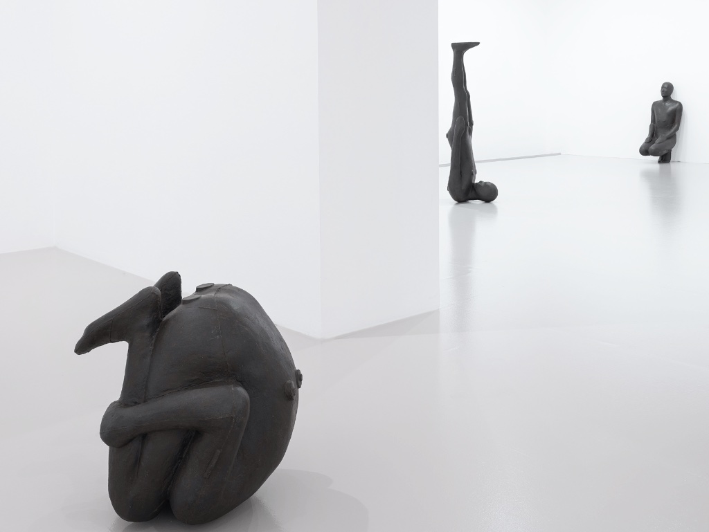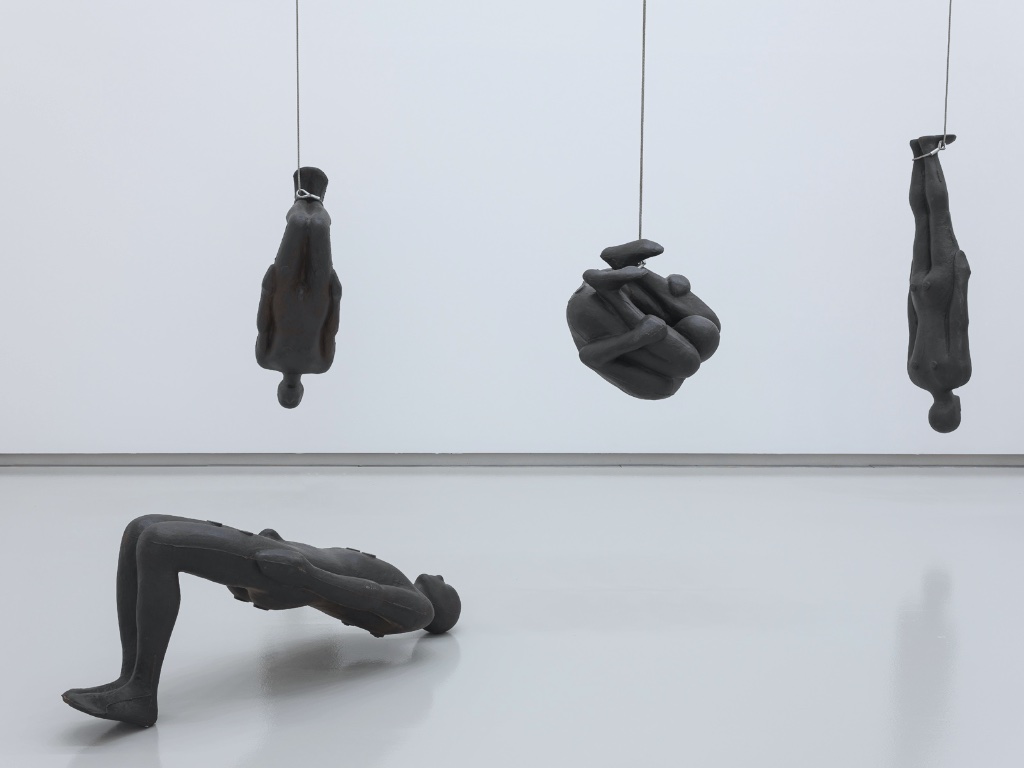 Gormley famously uses a mold of his own naked body as the basis for most of his works. The show begins in the museum’s modern temporary exhibition space with an installation Gormley created in 1995: “Critical Mass II,” made up of 60 life-sized cast-iron statues of his naked self in 12 different unnatural, painful-looking poses. Some are sitting up straight with legs stretched out at a perfect 90-degree angle, for instance, while others stand rod-straight with their heads bent at a 90-degree angle. Still others are curled up in the fetal position. Arranged in various configurations – hanging from the ceiling, for example, turned upside down or piled on top of each other like so many discarded corpses – they startle the visitor anew in each arrangement. There are no wall texts or labels to explain things, just the dark bodies against stark white walls.