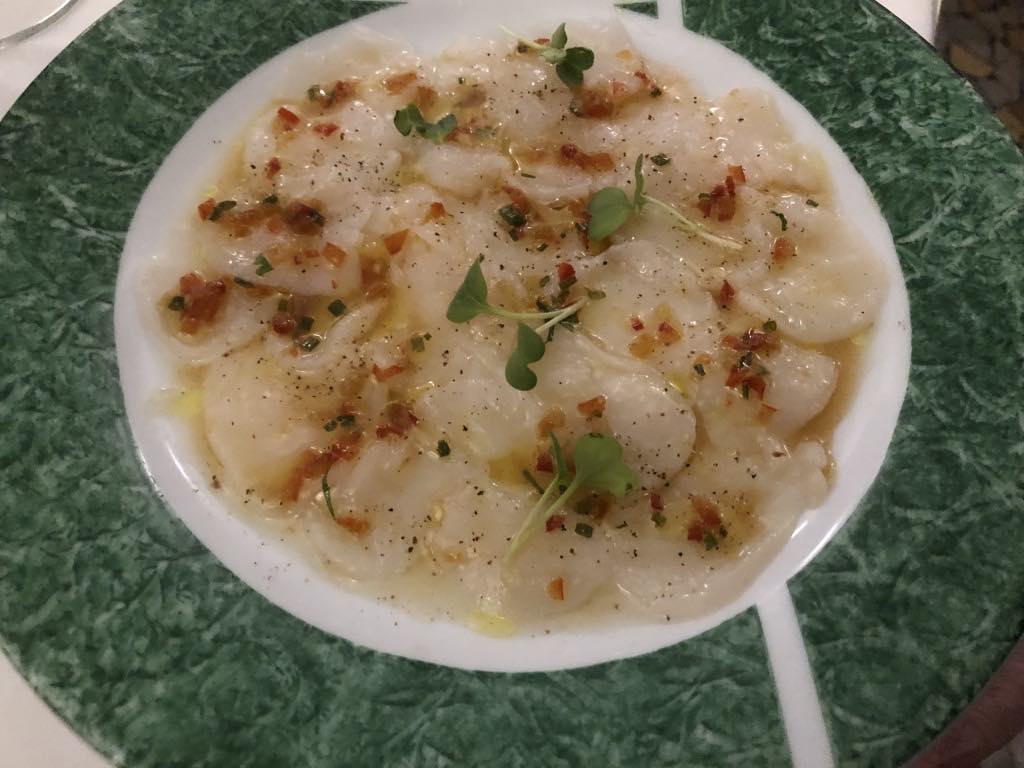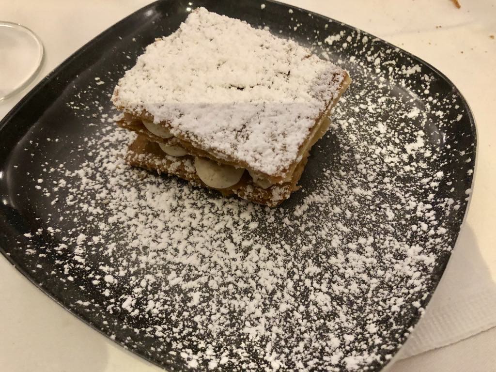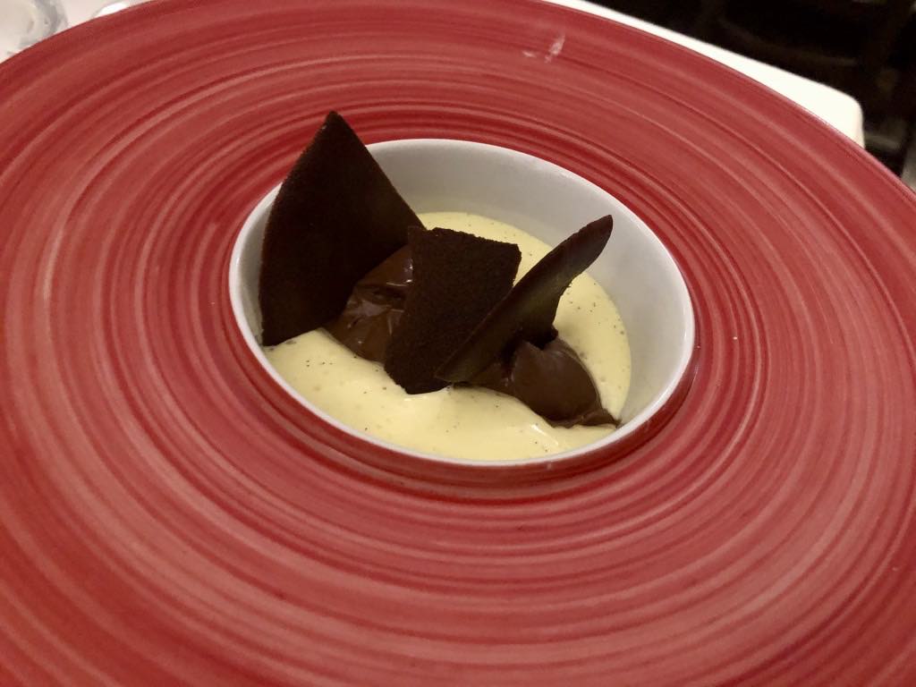 Desserts were a perfect millefeuille, with real-vanilla-flavored cream and crispy puff pastry, and a tasty dish of vanilla and chocolate cream topped with thin plaques of chocolate and flavored with saffron.