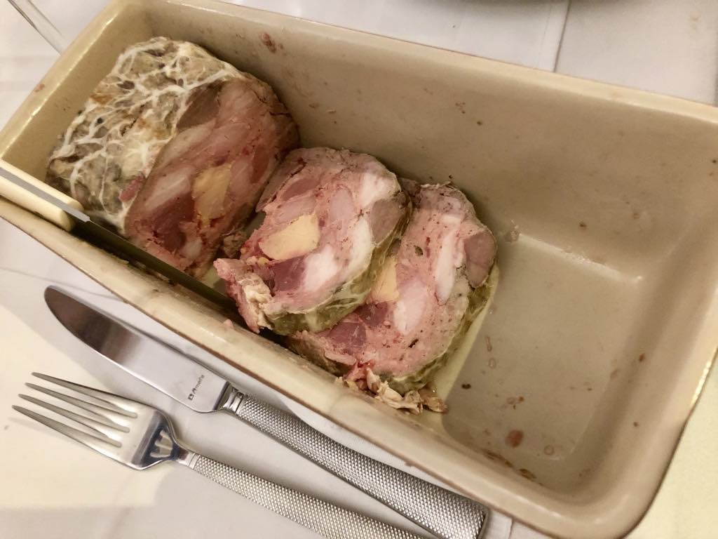 The lièvre à la royale was not the only unusual item on the chalkboard menu; another was oreiller de la belle Aurore. First concocted in the early 19th century, it is known as the Holy Grail of charcuterie. Named in honor of the mother of its inventor, Brillat-Savarin, this pâté en croûte contains some 15 types of meat, including 10 stuffed game meats (quail, pigeon, wood pigeon, partridge, grouse, mulard and mallard duck, pheasant, hare, wild rabbit, venison, etc.), foie gras, Bresse chicken, black truffles from Tricastin and pistachios.