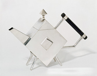 including a diamond-shaped silver teapot and another spaceship-shaped one with an angular handle and pointy feet, both of which belong in the Alessi catalogue today (some of his designs are, in fact).