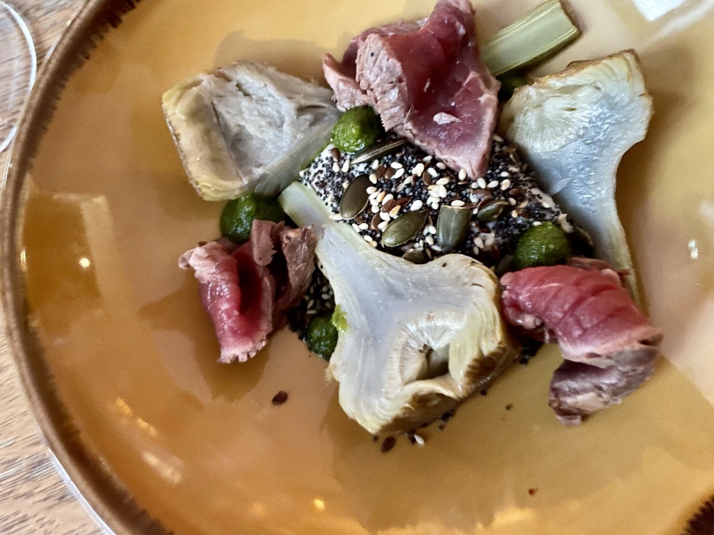 I got some of that meat right away in my starter of artichokes with pepper sauce and small slices of smoked Angus sirloin steak. The artichoke was slightly overcooked, but the beef was succulent and delicious, and the pepper sauce, with the felicitous addition of black sesame seeds, very tasty.