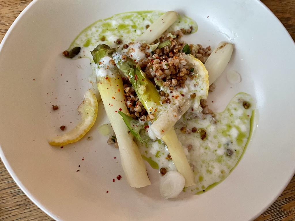 The other starter, of roasted white asparagus from the Loire Valley (sourcing!) with a sauce made of buttermilk and lemon (from Menton), topped with toasted buckwheat, was rather less interesting.