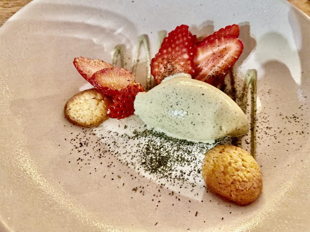 The other unusual (and unusually good) dessert consisted of strawberries in a spicy broth, with a sablé breton (shortbread cookie), mint–ginger ice cream and mentholated pesto.