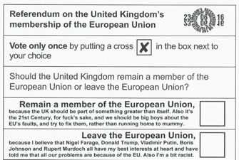As horrible as the prospects may be, the actual debates on social media have been lively and often humorous. My favorite document was a mock polling card by a supporter of the Remain campaign that managed to point out a few home truths in the small print under each option: