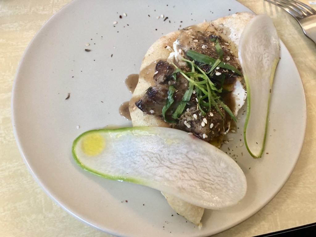 The surprise hit was the flatbread with labneh (cream cheese made from strained yogurt) and offal, which in this case consisted of chicken hearts and livers, seasoned with za’atar (a mixture of Middle Eastern herbs). Doesn’t sound thrilling, but it was – wonderfully tasty, down-home comfort food.