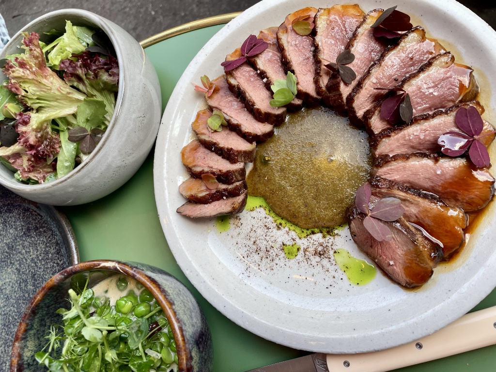 There were only three choices for the large plates for two: duck, fish and the pricey (€90) Black Angus beef picanha. They all sounded delicious thanks to their interesting accompaniments, but after much debating we finally chose the grilled Challans duck breast, a generous helping with veal jus and – since duck always has a fruity accompaniment – an unusual sauce of charred pineapple. One side dish was a superb bowl of fresh peas with guanciale (a more refined cousin of pancetta) and a smoky, creamy sauce. The other was an unimaginative salad bowl of lettuce leaves with a rather nice citrusy vinaigrette. Altogether, it was a fine but not very exciting main course.