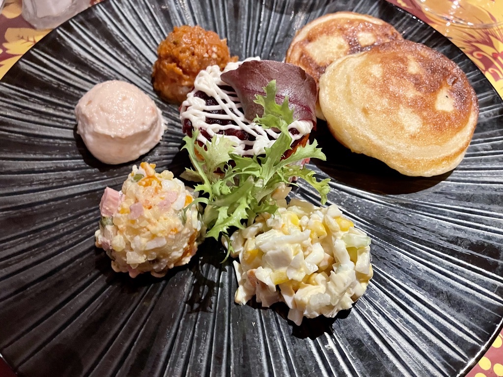 We wanted to taste everything and kept adding to our order to make sure we didn’t miss out on anything (except the caviar, priced at €120). We sampled the borscht (quite tasty, with chunks of beets, cabbage and other vegetables), the zakuski (an assortment of appetizers, including tarama, egg salad and potato salad), the homemade blinis with smoked salmon, the borscht, the pelmeni (dumplings in broth), the shachlyck (shish kebab) and, for dessert, the vatrushka (cheesecake).