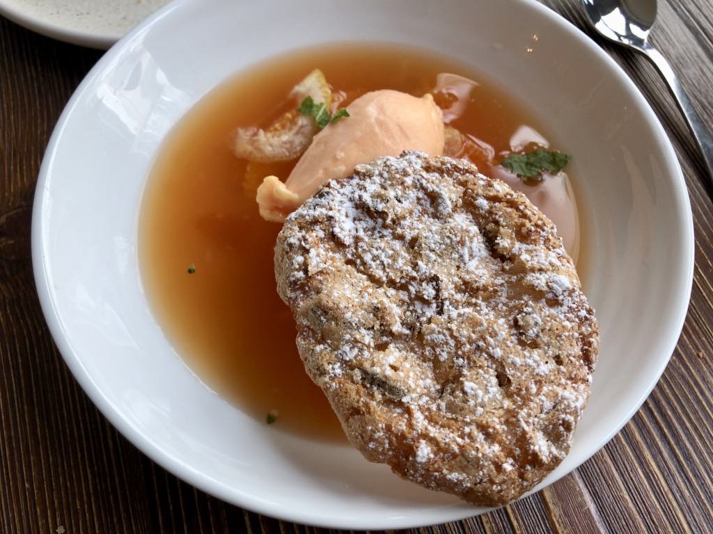 The other dessert made a perfect accompaniment to it: a cold citrus soup with a crunchy, nutty cookie and an orange sorbet.
