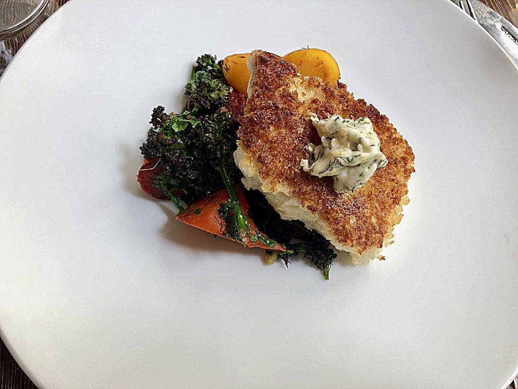 I had the merlu (hake), which was lightly breaded and accompanied by garlic-ginger butter, with multicolored carrots.