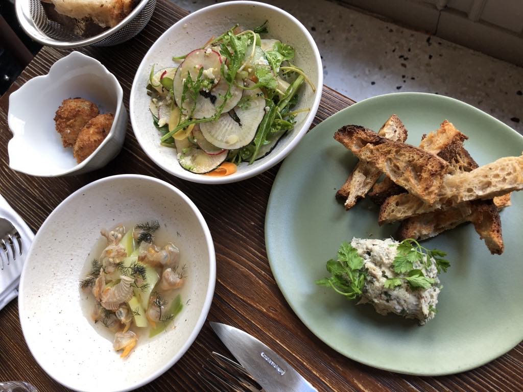 Mary and I loved the first course of surprise starters to be shared. No fewer than five of them arrived on the table: nicely crunchy croquettes of andouille, creamy fennel soup with sesame (in individual servings), mackerel rillettes with toast, cockles with fennel in dashi, and a complex salad with lots of fresh herbs, thin slices of black radish, carrot shavings, and more. Everything was wonderfully fresh and subtly flavored.