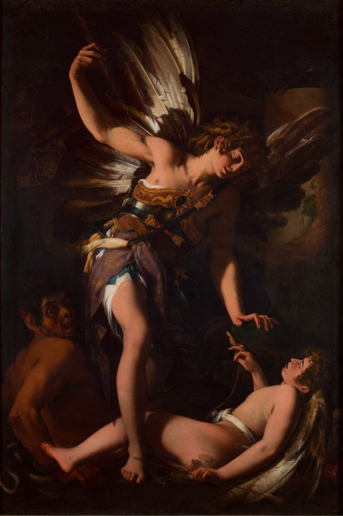 Among works by the brawling Caravaggio’s enemies in the exhibition, the most dramatic is “Sacred Love Versus Profane Love” (1602–03), by Giovanni Baglione, who unsuccessfully sued Caravaggio for libel. It gives the devil Caravaggio’s features and depicts profane love as a boy, an allusion to Caravaggio’s supposed homosexuality, while the angel represents sacred love.