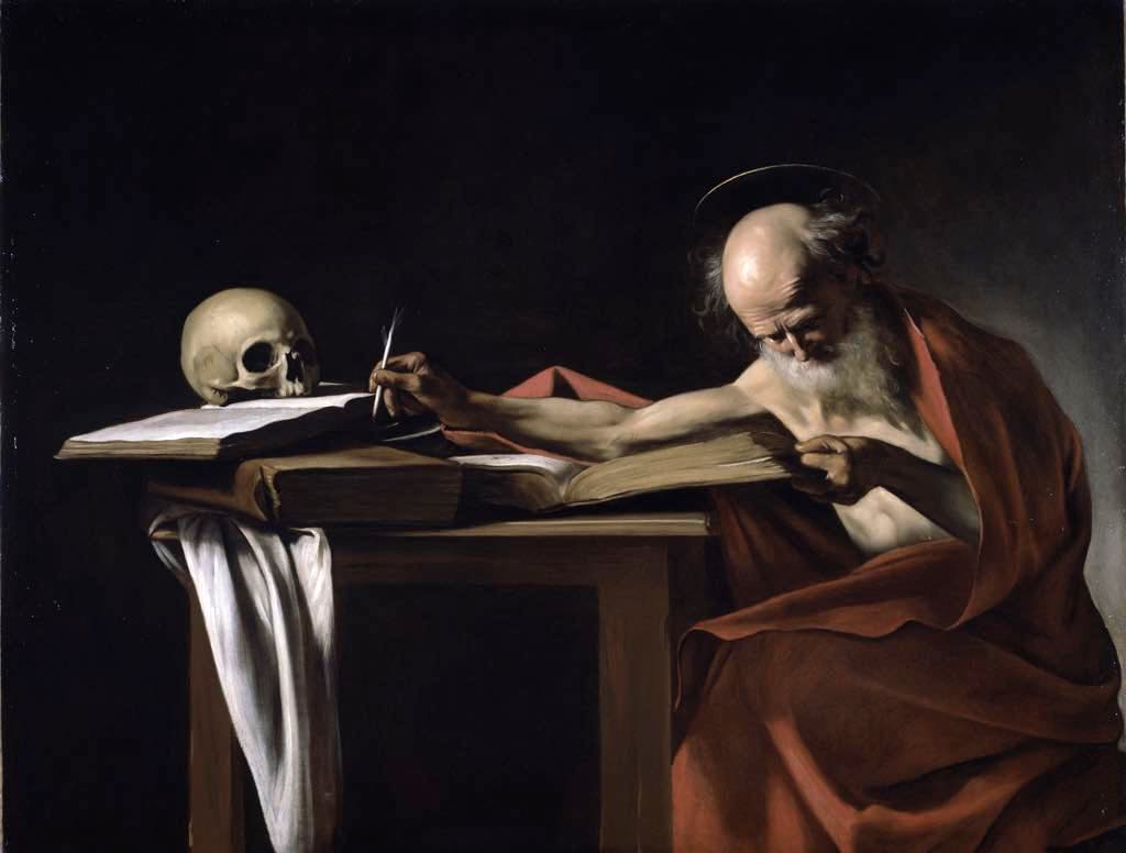 Caravaggio’s use of light, dark and color even brings drama to the depiction of an old man lost in contemplation in “Saint Jerome Writing” (c. 1605). A plain background in this masterpiece focuses attention on the red-robed saint, his muscular right arm stretched out across the table while his left hand holds the book he is absorbed in. On the other side of the table, a skull perfectly echoes his bald head.