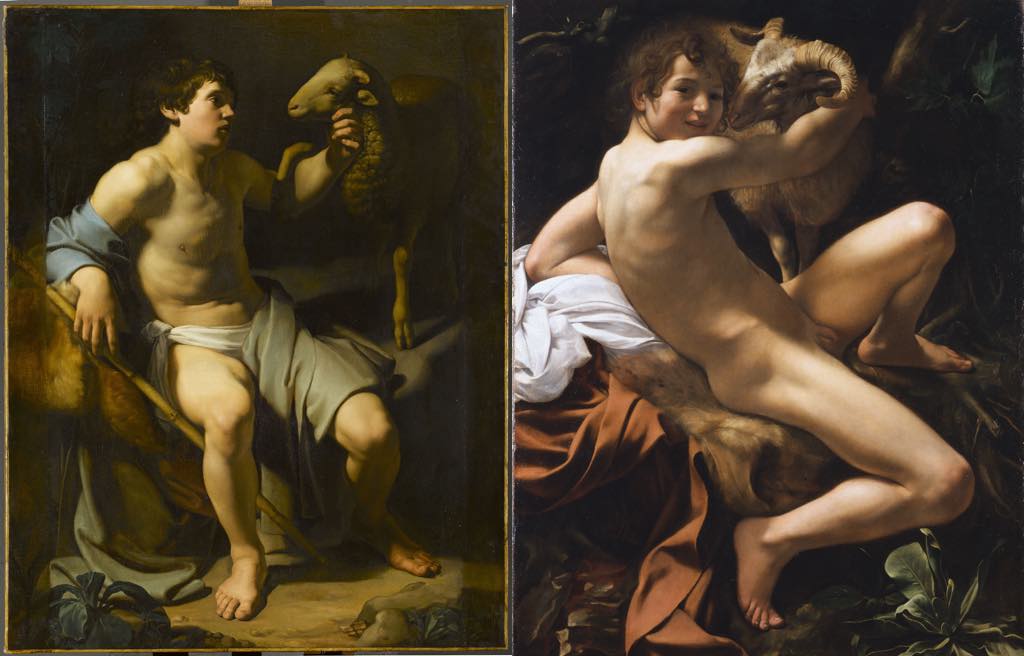 Another telling comparison in the show places Caravaggio’s “John the Baptist” (1602) next to Bartolomeo Manfredi’s “John the Baptist” (1613-15). Both zoom in on the young Baptist holding a sheep, but Caravaggio’s tightly framed painting shows him shockingly naked as he twists around to look at the viewer with a laughing smile while wrapping his arm affectionately around the animal. Manfredi’s Baptist, his private parts modestly covered, sits passively and pensively staring at the sheep he holds. The latter image, obviously influenced by Caravaggio’s painting, may have been more pleasing to Church authorities, but Caravaggio’s dynamic version is so much more full of life and joy that one cannot help but prefer it to Manfredi’s.