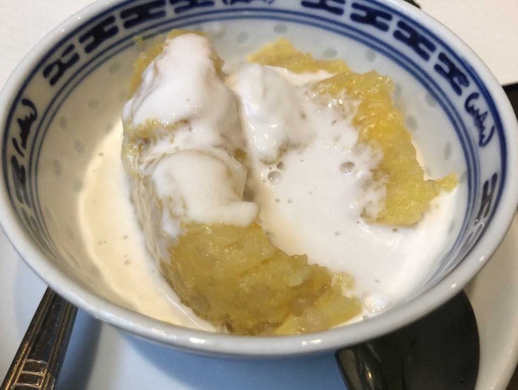 For dessert, we shared a comforting cornmeal/tapioca pudding that was not too sweet, but now that I look at the menu again, I wish we had tried the other dessert choice, something I have never before tasted: pandan cake, a a bright-green (from the juice of Pandanus amaryllifolius leaves) Southeast Asian sponge cake. Next time.
