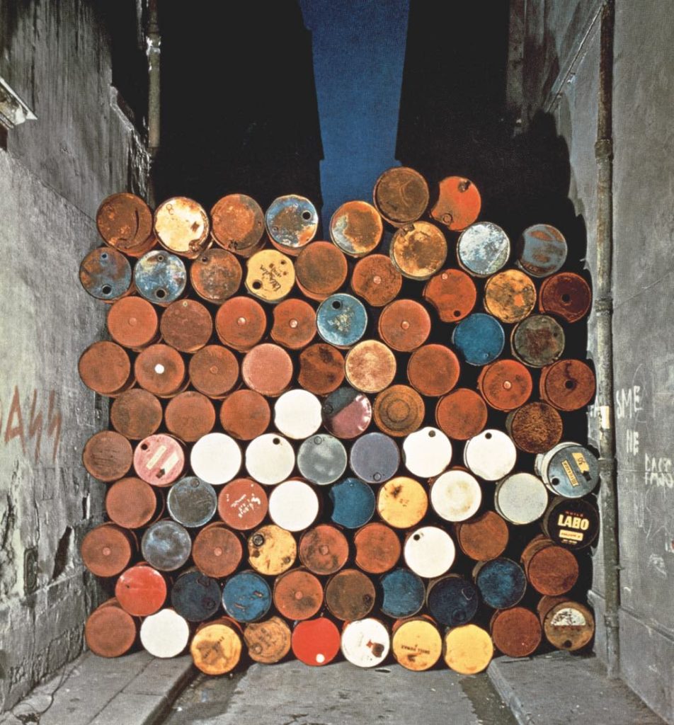 The exhibition first takes a quick look at Christo’s early painted portraits, his small-scale wrapped sculptures and a series of covered shop windows. There is also a re-creation of a “temporary wall” of stacked oil barrels, which Christo and Jeanne-Claude built in Paris guerrilla-style without permission one night in 1961. This wall, made of those ugly symbols of the fuel of modern life, was meant by the artists as a comment on the construction of the Berlin Wall. It blocked off a small street in historic Saint Germain-des-Prés and was not appreciated by the Paris police, who quickly made them dismantle it.