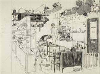 Some wonderful artists are represented in the show of contemporary drawings from the Boijmans Van Beuningen Museum in Rotterdam, known for its collection of works on paper. Although the exhibition’s title dubs them “Surrealist” – and I suppose they are in their quirky, dreamlike visions – they have little in common. I especially liked the extremely skillful and evocative large-scale drawings of Charles Avery, whose pathos-filled scenes tell inexplicable stories. In one, a broken-down man sits on the sidewalk with an array of “stone mice” (stones vaguely shaped like mice; the title of the work) spread out on a piece of cardboard in front of him, ignored by the people in the street, all familiar types, among them a hunched vagrant with a cigarette hanging out of his mouth, his posture perfectly captured. In the eerie “Avatars” (2005), a traumatized couple looks on dolefully while a sort of veterinarian works on a creature lying on an examining table. On the shelves on