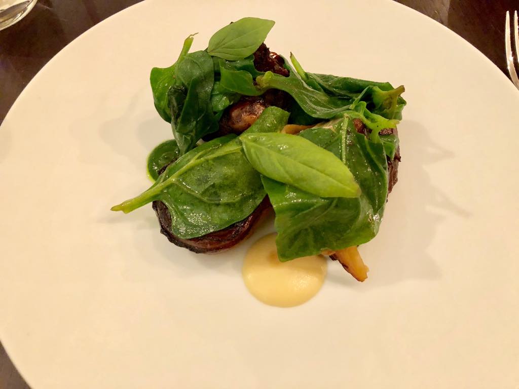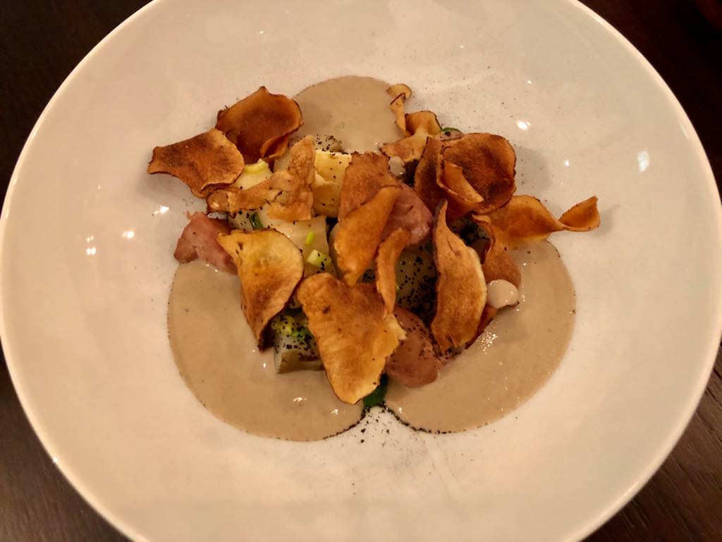 The other starter we tried was also delightful and original, although not as exciting as the eels, which we all loved. It consisted of sot l’y laisse (oysters, those two tender morsels on the bottom of a chicken; the French name translates as “only an idiot would leave it behind”) and various root vegetables with contrasting flavors in a mushroom and tonka bean sauce, the whole thing topped with perfect, grease-free homemade vegetable chips. Only an idiot would leave behind those delicious sauces, so we sopped them up with the excellent, crusty dark bread.