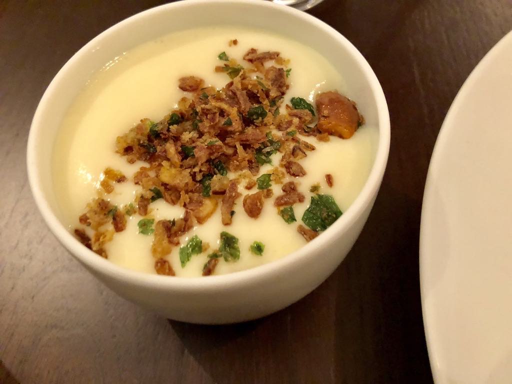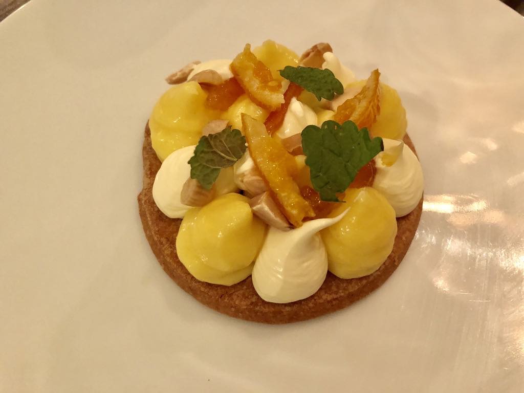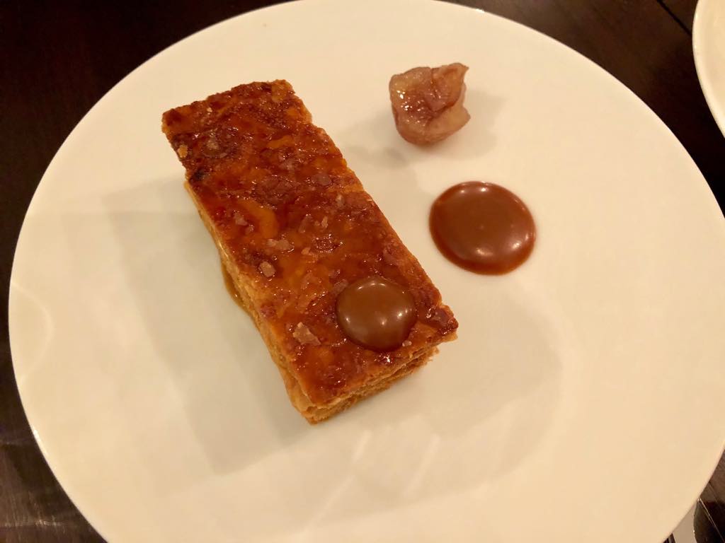 For my main course, I had the braised Limousin-beef cheeks, rich and melt-in-the-mouth tender, served with a caramelized onion and brown butter sauce with apple. On the side was a to-die-for dish of potato “cream,” the lightest version of mashed potatoes I have ever tasted, topped with garlic chips.