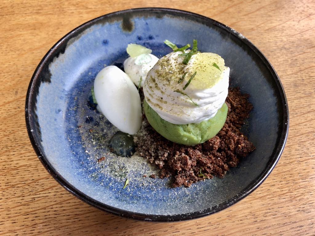 The high point of the meal turned out to be the desserts: a minty/creamy concoction and a riff on pears. Of the mignardises that followed, one was truly creative and interesting: a charcoal beignet with vieille prune ganache.