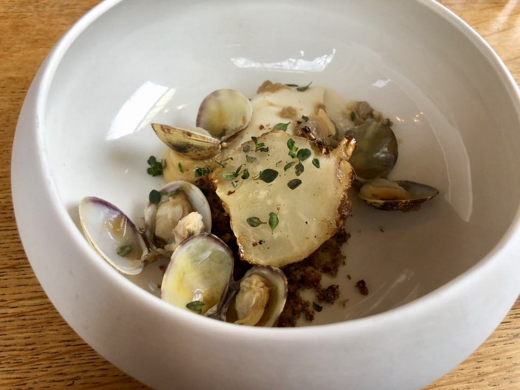 We started with the palourdes (clams), which turned out to be the small bivalves I would call coques (cockles), in a lemony sauce with black cardamom. I liked the sauce but had a hard time enjoying the cockles, which tasted less than perfectly fresh.