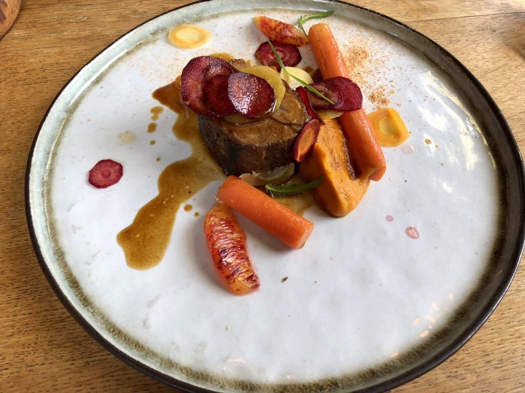 The colorful main course was veal paleron with carrots and grilled orange sections. This cut of veal should be very tender but was a bit dry, and the dish as a whole was fine but not too exciting.