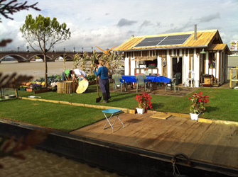 The self-sustaining “House on the Water,” an installation at Evento, is real but temporary and inhabited by actors. |