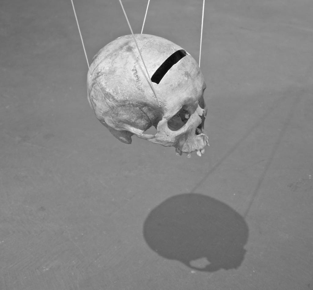 Nussbicker’s subtle, meditative works often refer to ancient cultures. One example is this S-shaped, skull-headed bronze carynx, a trumpet similar to those used in battle by Iron Age Celts, who would have placed the head of an open-mouthed boar or another animal at the end of the instrument.