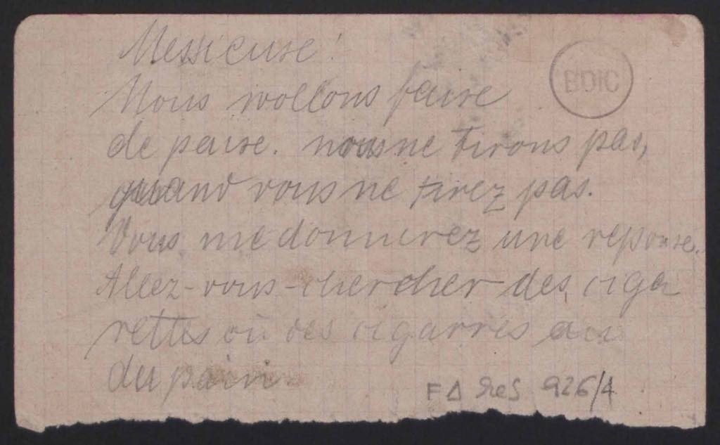World War I looms large in the section devoted to Peril, with letters or poems sent by men about to die on the Western Front to their loved ones and notes written by German soldiers to their French counterparts on the battlefield asking them to stop shooting and to share their food.