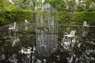 Another garden that invites contemplation is “Cheveux d’Anges” by architect Christophe Marchalot and artist Félicia Fortuna. They have placed a few garden chairs in a shallow water lily pond. In a greenhouse in the middle of it, ethereal, silvery Spanish moss (Tillandsia usneoides) grows without earth, roots or even its usual host tree.