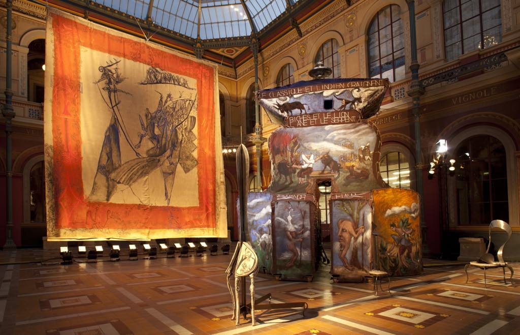 The École des Beaux-Arts is showing a group of monumental works on various themes: Indians, Bacbuc (the “holy bottle” in Hebrew) and ellipses. Some of these pieces are fantastical structures built of paintings. One is like a house and can be entered by visitors, while the paintings inside another can only be seen by peering through the metal tubes that pierce it. These older works from different periods are full of strange creatures like the grotesque humans whose faces and genitals have migrated to their backs.