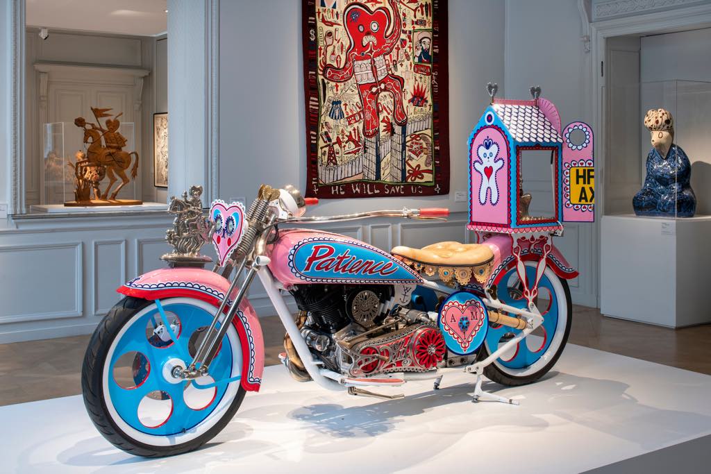 Perry draws much of his subject matter from his own life. One major piece in the show is inspired by his interest in motorcycles. His custom-built “Kenilworth AM1” (2010), displayed in a section on masculinity, is a kitschy monster, painted in newborn shades of blue and pink, and decorated with sexual symbols (look closely at the seat), hearts, teddy bears and such injunctions as “patience” and “humility.” In Perry’s world, these are the new attributes of masculinity.