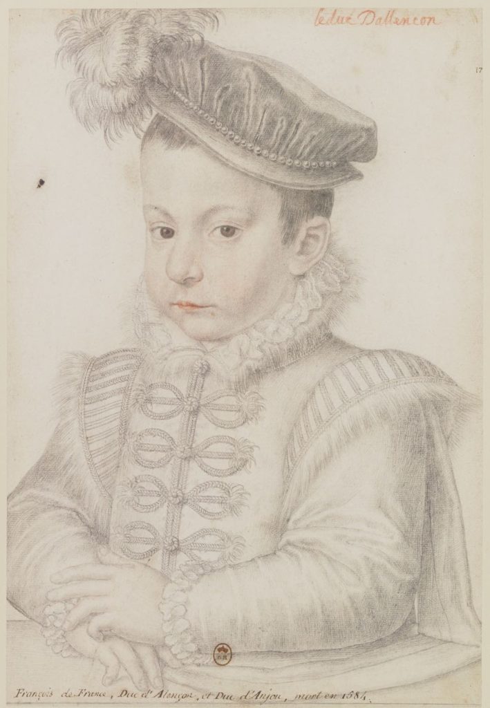Henri himself was handsome as a young man but became rather less so as he aged, as can be seen in a series of portraits, including this one in which he appears massive in an unusual frontal pose, probably in imitation of Hans Holbein’s portraits of Henry VIII across the Channel.