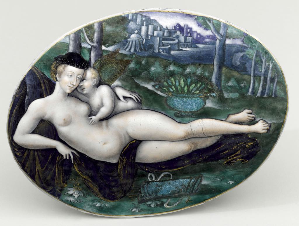 Worth a close look are a few lovely drawings of Henri and his siblings as children, sent to their absent parents as a kind of health bulletin, and a nude portrait in enamel, “Vénus et l’Amour” (1550), by Léonard Limosin, that probably represents another of Henri’s mistresses, Lady Fleming, the illegitimate daughter of James IV of Scotland, with whom he had a son.