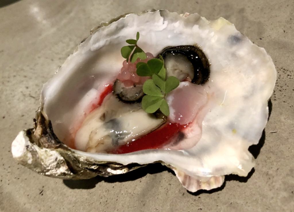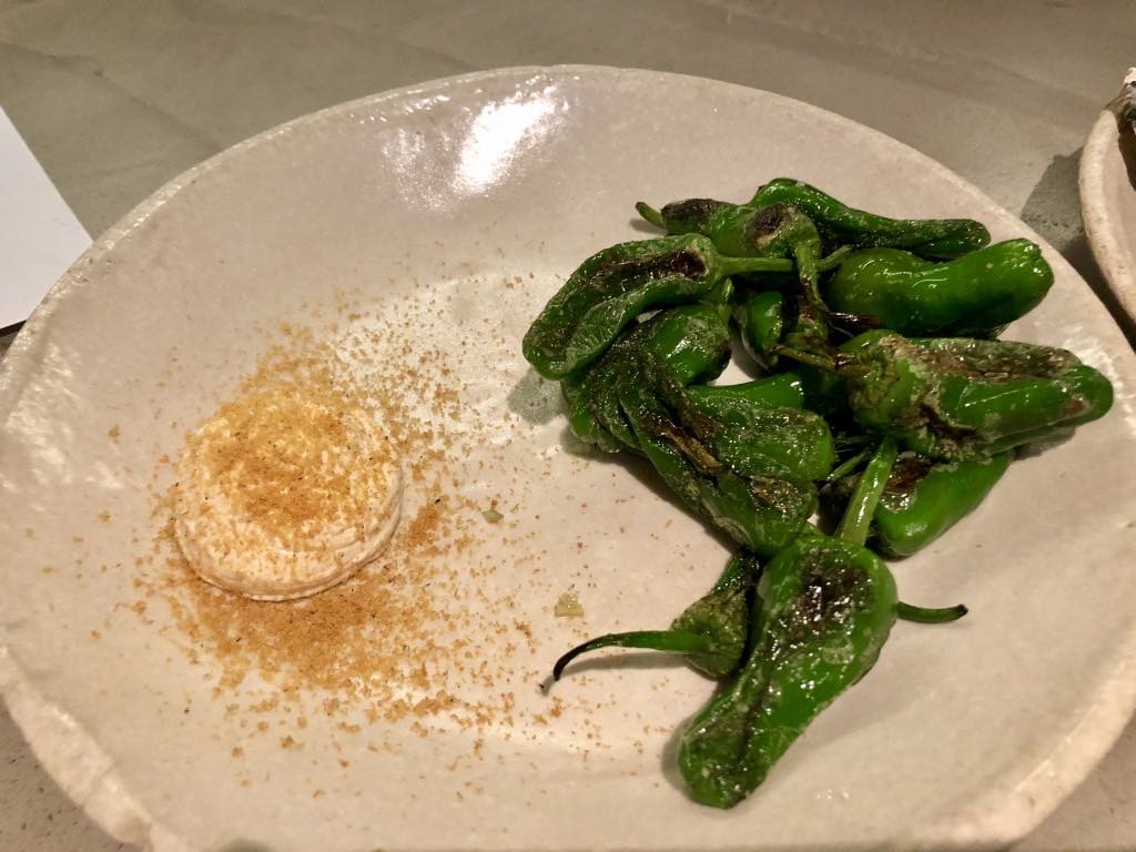 Korus insists on the best-quality products. Everything is made in-house except for certain cold cuts and cheeses. The menu offers only two choices for each course, but what wonderful choices they are! And they were supplemented with two very amusing amuse-bouches: sparkling fresh oysters with raspberry cream and wood sorrel, a brilliant combination, and a dish of pimientos de Padrón beautifully paired with a smoky tarama sprinkled with poutargue (cured fish roe).