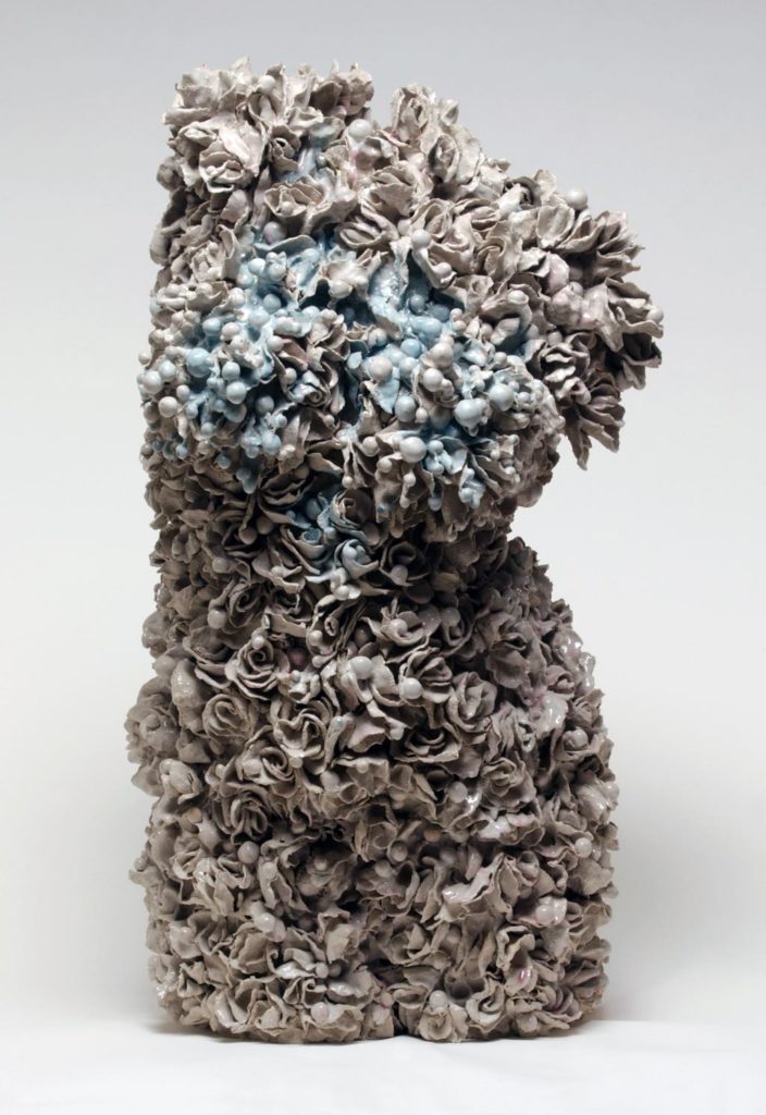 One example is a sculpture of a woman’s torso, “Odore di Femmina” (2004), designed by Johan Creten. This piece was made with an 18th-century technique called pastillage and is covered with hand-sculpted biscuit-porcelain flowers attached to a molded form.